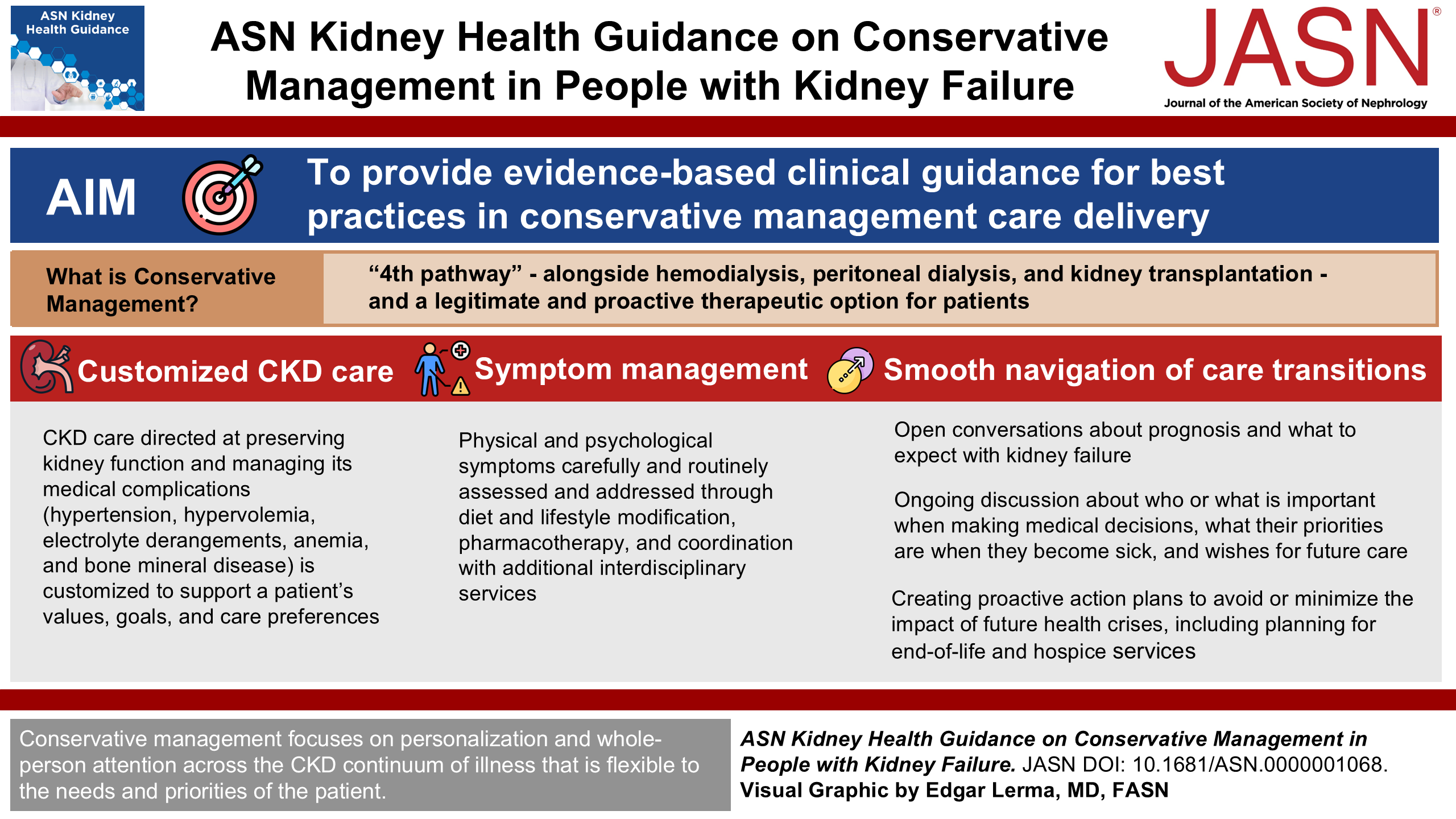 This guidance provides evidence-based clinical guidance supporting best practices in three components of the conservative management care pathway: customized CKD care to align with a person's values and goals, symptom management, and navigation of care transitions.
